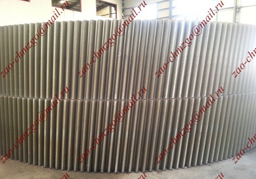 Предлагаем венцы для мельницы углеразмольной Ш-50 ч.№313740И1. Венцы стальные разъёмные состоят из 2-х секторов, зацепление косозубое,модуль m=20, число зубьев z=244. Наружный диаметр венца 4943.7 мм, внутренний диаметр венца 3850 мм. полная ширина венца 800 мм. Предлагаем также шестерни приводные №13736,модуль m=20, число зубьев z=41 и вал-шестерни №15292И1,стенку торцевую заднюю №В132-0910И1-0 и стенку торцевую переднюю №В132-09С8И1-0 к мельнице Ш-50. Изготовим приводные шестерни к венцам (косозубое или прямозубое зацепление до m=50).