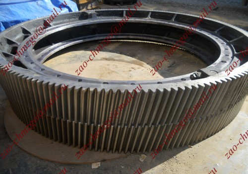 Предлагаем венцы для мельницы МРГ55*75 ч.№1-16536МЧ. Венцы стальные разъёмные состоят из 4-х секторов, зацепление косозубое,модуль m=25, число зубьев z=252. Наружный диаметр венца 6391.45 мм, внутренний диаметр венца 3150мм. посадочный диаметр 3300 мм - по оси крепежных отверстий. Полная ширина венца 900 мм. Предлагаем также шестерни приводные,вал-шестерни №7-646358(1-198655), модуль m=25, число зубьев z=25-27(46-48) к мельнице МРГ55*75. Изготовим приводные шестерни к венцам (косозубое или прямозубое зацепление до m=50).