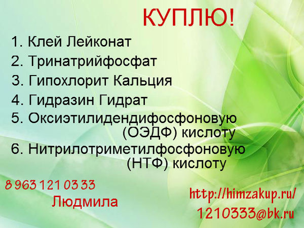 Скупаем в больших количествах химическое сырьё: Тринатрийфосфат, Гипохлорит Кальция, Гидразин Гидрат, Клей Лейконат, Нитрилотриметилфосфоновую (НТФ) и Оксиэтилидендифосфоновую кислоту (ОЭДФ). Мы купим остатки, неиспользованный материал, с хранения, с предприятий и заводов, неликвид и т. д. Потребности постоянные. Покупаем дорого, оплачиваем сразу. Звоните, цена договорная. Самовывоз. Людмила.
