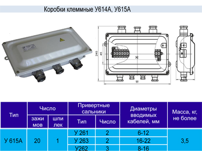 • Коробка клеммная У-614 предназначена для соединения и разветвления электрических цепей, выполняемых контрольными кабелями с числом жил до 27 и силовыми кабелями с алюминиевыми и медными жилами сечением 1,5 – 6 мм.