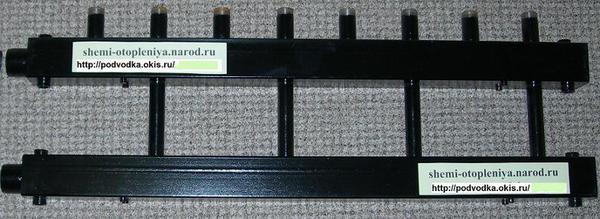 Коллектор для отопления это специальное устройство, которое собирает остывший теплоноситель и распределяет нагретый в котле теплоноситель для подачи к радиаторам, к тепловым завесам, к тёплым полам и другим отопительным приборам. А остывший теплоноситель собирается в коллекторе отопления для нового нагрева в котле. Коллекторная система отопления напоминает лучи, так от коллектора отопления до каждого прибора отопления есть свой индивидуальный трубопровод, подающий нагретый теплоноситель, а остывший теплоноситель собирается в коллекторе отопления. При такой системе отопления происходит более равномерная теплоотдача ведь в лучевой системе можно отрегулировать каждый луч. Соответственно управление каждым отопительным контуром увеличивает КПД всей системы. Можно отрегулировать температуру в каждой комнате, и любого отопительного прибора. Для уменьшения количества труб отопления используют: один большой распределительный коллектор отопления в котельной со входом и выходом к котлу 1 ½ дюйма (40 мм) который распределяет теплоноситель по контурам поэтажно и по функциональным признакам например первый контур на бойлер, второй контур на тёплый пол, третий контур – первый этаж, и т. д.. На первом этаже например для пяти радиаторов устанавливают поэтажный распределительный коллектор он меньше размером имеет вход и выход1 дюйм(25 мм). От него отходят пять лучей к каждому радиатору трубой ½ дюйма (15 мм). В этом случае используют от распределительного коллектора отопления в котельной до поэтажного коллектора ( гребёнки ) 2 трубы диаметром1 дюйм(25 мм) вместо 10 труб15 мм. При этом уменьшается потери тепла, гидравлика, и т. д.. Коллектор отопления в котельной представляет две квадратных трубы 80 х 80. Первая труба служит для распределения по контурам горячего теплоносителя. Вторая для сбора остывшего теплоносителя то есть «обратки». Для движения теплоносителя от котла к радиаторам на каждый конур устанавливается свой циркуляционный насос диаметром1 дюйм(25 мм).