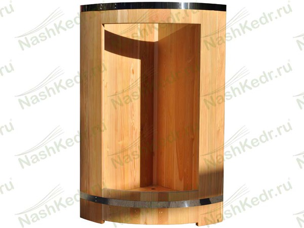 Угловая душевая кабина из лиственницы требует для размещения только один метр квадратный, а помогает разрешить огромное количество вопросов проведения водных процедур. Душевая кабина оснащена держателем для шторки, системой слива, поддоном и прочими необходимыми аксессуарами.