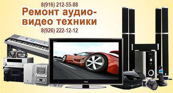 Ремонт с выездом на дом по Москве видеомагнитофонов VHS, DVD плееров, рекордеров, видеодвоек, музыкальных центров, караоке, домашних кинотеатров, телевизоров, мониторов, сабвуферов, акустических колонок.