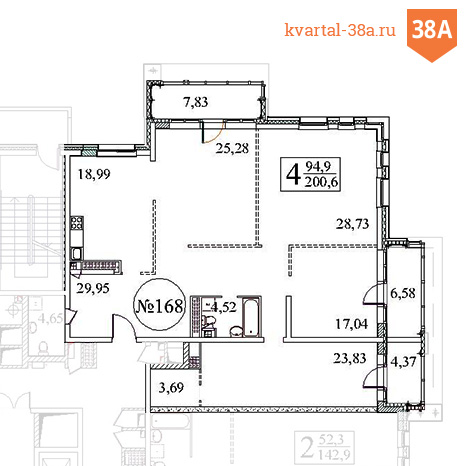 4 комнаты (25.2 кв.м; 28.7 кв.м; 17.0 кв.м; 23.8 кв.м)