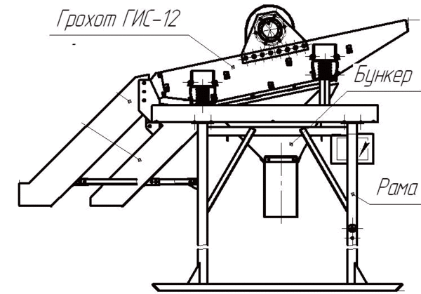 Агрегат сортировки с грохотом ГИС-12 состоит из сварной рамы на полозьях, площадок обслуживания, лестницы для входа на площадки обслуживания и грохота, установленного на тумбах, крепящихся к раме. Под грохотом на раме установлен бункер, а в конце короба грохота – лоток нижний и лоток верхний для отвода рассортированного по фракциям материала.