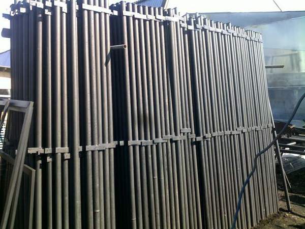 Металлические столбы для заборов, покрытые грунтовкой черного цвета. Сверху имеется заглушка от воды, толщина металла 2 мм