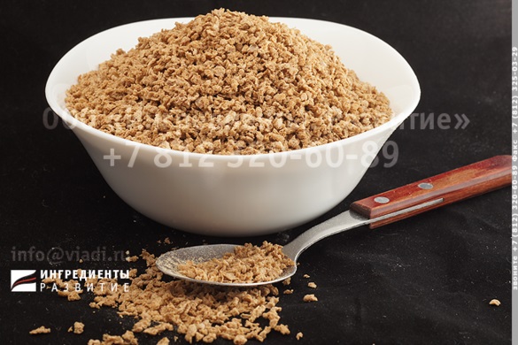 "Белок соевый текстурированный «Опттема» M-03 Brown - продукт экструзии соевого шрота с добавлением натурального карамельного красителя (E150d), имеющий пористую структуру, позволяющую связать и удерживать большее количество влаги. Воссоздает текстуру наиболее ценных пищевых продуктов - мяса, рыбы, грибов в зависимости от гаммы вкусовых и ароматических добавок; может использоваться в качестве продовольственного сырья для частичной замены (от 15 до 30%) мясного сырья, а также в качестве самостоятельного блюда.