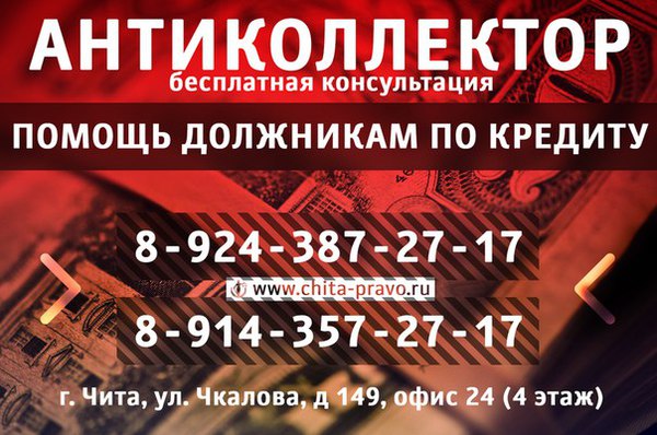 Юрист по кредитам - АнтиКоллектор в Чите. #Бесплатная консультация по телефону*. Банкротство физических лиц в Чите. При возникновении трудностей по уплате мы помогаем урегулировать конфликт в досудебном и судебном порядке с банками или коллекторами. Помощь в работе с судебными приставами на стадии исполнительного производства. Уменьшение выплат, возврат излишне уплаченных денег, юридическая защита от произвола банков и коллекторов. Новая услуги – представление интересов перед кредиторами, приставами. Другие юридические услуги…