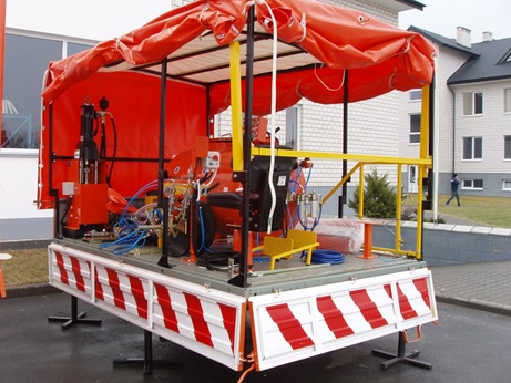 На платформе по левой стороне установлен разметочный блок с двумя парами покрасочных и посыпочных пистолетов (Kamber).