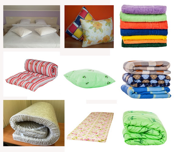 Сопутствующие товары : постельное белье, одеяла, подушки, покрывала, полотенца, металлические кровати, прикроватные тумбочки, шкафы для одежды, столы обеденные, табуреты, вешалки настенные.