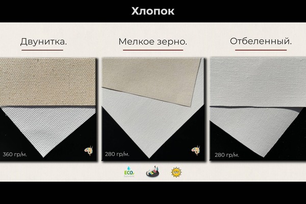 Плотность холста: мелкое, среднее и крупное зерно. (280 гр/м2 - 320 гр/м2 - 380гр/м2 соответственно)