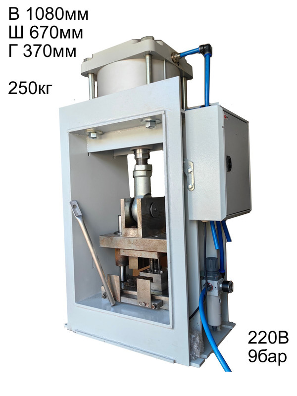 Полноценный двухоперационный штамп на колонках, вся пневматика Camozzi (Италия). Компактные размеры и питание от бытовой сети 220В позволяют разместить производство на ограниченной площади. Управление через ножную педаль, что освобождает оператору обе руки для работы.
