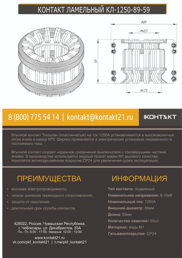 Втычной контакт Тюльпан (пластинчатый) на ток 1250А устанавливается в высоковольтный отсек ячеек и камер КРУ. Широко применяется в электрических установках переменного и постоянного тока.