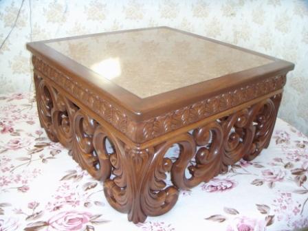 Резной журнальный столик орех,столешница из искуственного камня цвета кофе с молоком под камень,резьба прорезная,ажурная,размер 940x940x500