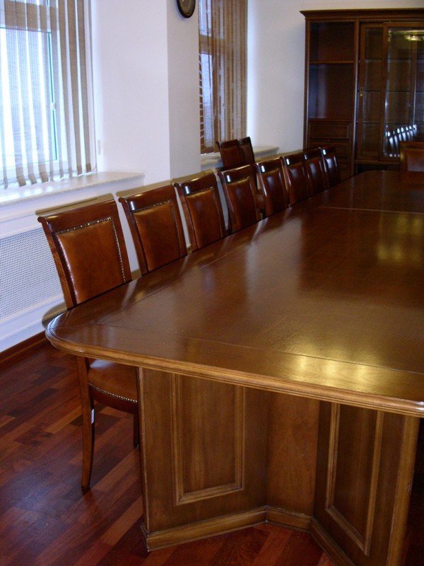 Стол для переговоров 6 метров, стулья кожаные 20 шт. Стенка- библиотека с раздвижными стеклянными дверьми, греденция, фригобар, 2 комода, Диван кожаный, кресло кожаное, стол кофейный, письменный стол обтянутый кожей на двух тумбах, кресло для руководителя деревянное на колесах обтянутое кожей, приставная тумба к столу. Деревянные жалюзи в цвет кабинета.Срок эксплуатации 7 месяцев. Состояние идеальное.
