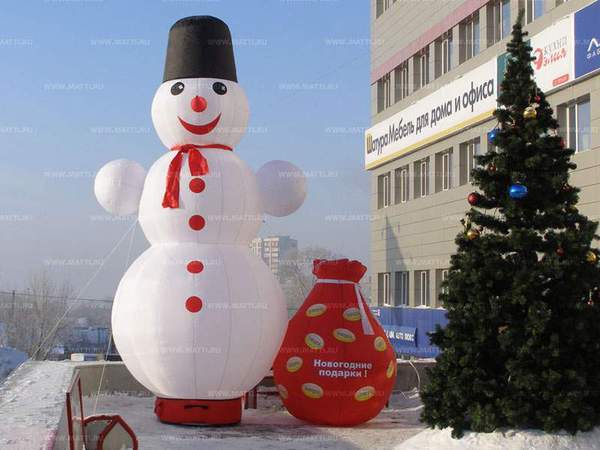Пневмофигура снеговик изготовлена их прочного и износостойкого материала. Она может устанавливаться как в помещении, так и на улице. Любые формы, размеры, конфигурации, цветовая гамма. Высота от 2,5м. Мы не посредники - мы производители.
