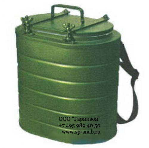 Термос армейский ТВН 12л предназначен для хранения и транспортировки горячей пищи или любых видов пищевых продуктов в подогретом виде в полевых условиях. Термос такого рода может использоваться в самых различных целях – как в военное, так и в мирное время; как летом, так и зимой. Универсальность этого термоса в его надёжности и относительно небольших размерах. А состоит термос армейский ТВН 12л из корпуса, колбы из пищевого нержавеющего покрытия и крышки. Корпус термоса очень надёжен, так как изготовлен из холоднокатаного стального листа марки КП 0,8 по государственному стандарту ГОСТ 9045-80 и имеет антикоррозийное и декоративное покрытие. Также стоит отметить, что корпус выкрашен эмалью защитного цвета, что делает его вполне пригодным для использования в случаях, где требуется максимальная маскировка объекта от средств оптической разведки. Термос армейский ТВН 12л имеет округлую форму. Внутрь корпуса вставляется цельнотянутая колба из пищевого нержавеющего покрытия. Бачок упирается в дно термоса на специальную деревянную крестовину или же специально проложенную на дне термоизоляцию. Сверху бачок термоса закрывается крышкой, которая выполнена из пищевого алюминия и специальной пищевой резины в месте соприкосновения с пищевыми продуктами внутри термоса. За счёт этой резины также обеспечивается герметичность термоса, что расширяет возможности его транспортировки, а также положительно влияет на уменьшение теплоотдачи и, соответственно, увеличивает срок держания тепла термосом в закрытом положении. Герметичность и теплоизоляция позволяют хранить и транспортировать в термосе армейском ТВН 12л любую пищу, будь то первые или вторые блюда, кипяток или готовый горячий напиток. Крышка термоса при закрытии прижимается к бачку специальными болтами. Обратите внимание, что перед каждой эксплуатацией термос нужно в обязательном порядке промыть кипятком.