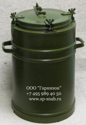 Термосы армейские 36л с колбой из нержавеющей (тонколистовой коррозийностойкой) стали. Термосы армейские предназначены для хранения и транспортировки горячей пищи в полевых условиях. Армейские термосы состоят из корпуса (углеродистая сталь загрунтована и покрыта эмалью защитного цвета) и вынимающейся колбы. Герметичность термоса обеспечивается прокладкой из пищевой резины между корпусом и крышкой. Это позволяет использовать армейские термосы как для первых, так и для вторых блюд. Масса, не более 17кг, Температура пищи с первоначальной t90С по истечении 6 часов, не менее, 65С, Габаритные размеры, 670х350х240мм, d=400мм